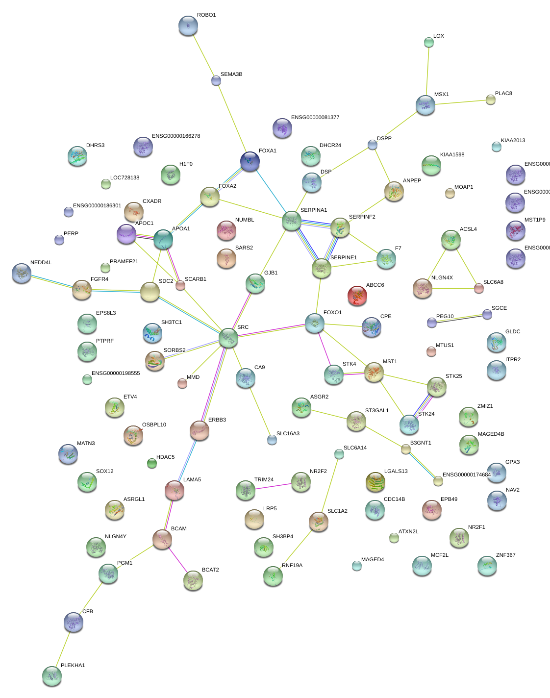 Network of associatons between targets according to the STRING database.